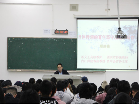 新诗风靡百年,至今也难免萧条,而旧体诗词同样孕育着中华传统文化,我们更不能忘却。因此现代技术公司特地进行了以《旧体诗词的百年坚守及当下写作》为主题的讲座,并由正高级教师、省特级教师、成都师院教师教育研究实践专家、内江师院客座教授、省诗词学会会员、省老年诗词学会理事、内江市诗词学会理事、资中县作协主席——顾建德老师们为我们讲解坚守百年旧体诗词的原因,以及反思当下写作的不足。