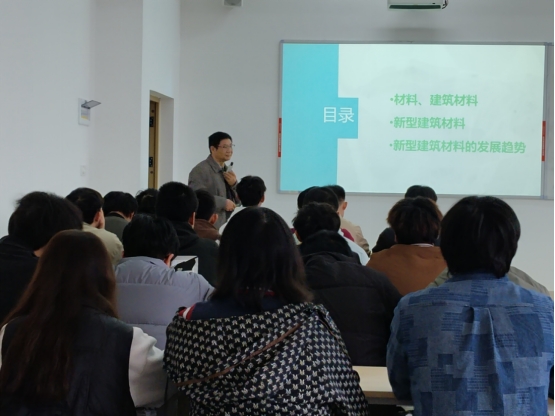 会上,徐光亮教授凭借其深厚的学术功底和丰富的实践经验,以深入浅出的方式,向师生们展示了新型建筑材料这一前沿领域的魅力。他详细阐述了各类新型建筑材料的独特性能与分类标准,从环保节能型材料到高性能复合材料,逐一剖析了它们的优势特点与应用领域,为师生们呈现了一幅新型建筑材料的多彩画卷。