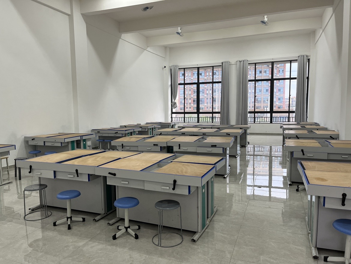 读识图实训室归属智能建造实验实训中心,建筑面积134㎡,主要服务于土木工程、工程造价、工程管理等多个专业开展实践教学。实验室配备36张双人专业制图桌,承担着《结构施工图识读》《工程制图》《平法钢筋识图与算量》《工程制图与识图》等实验教学任务,可开展柱结构施工图识读、梁结构施工图识读、板结构施工图识读、楼梯结构施工图识读、剪力墙结构施工图识读、基础结构施工图识读、基础构件识图与算量、梁、柱、板构件识图与算量等实训项目。