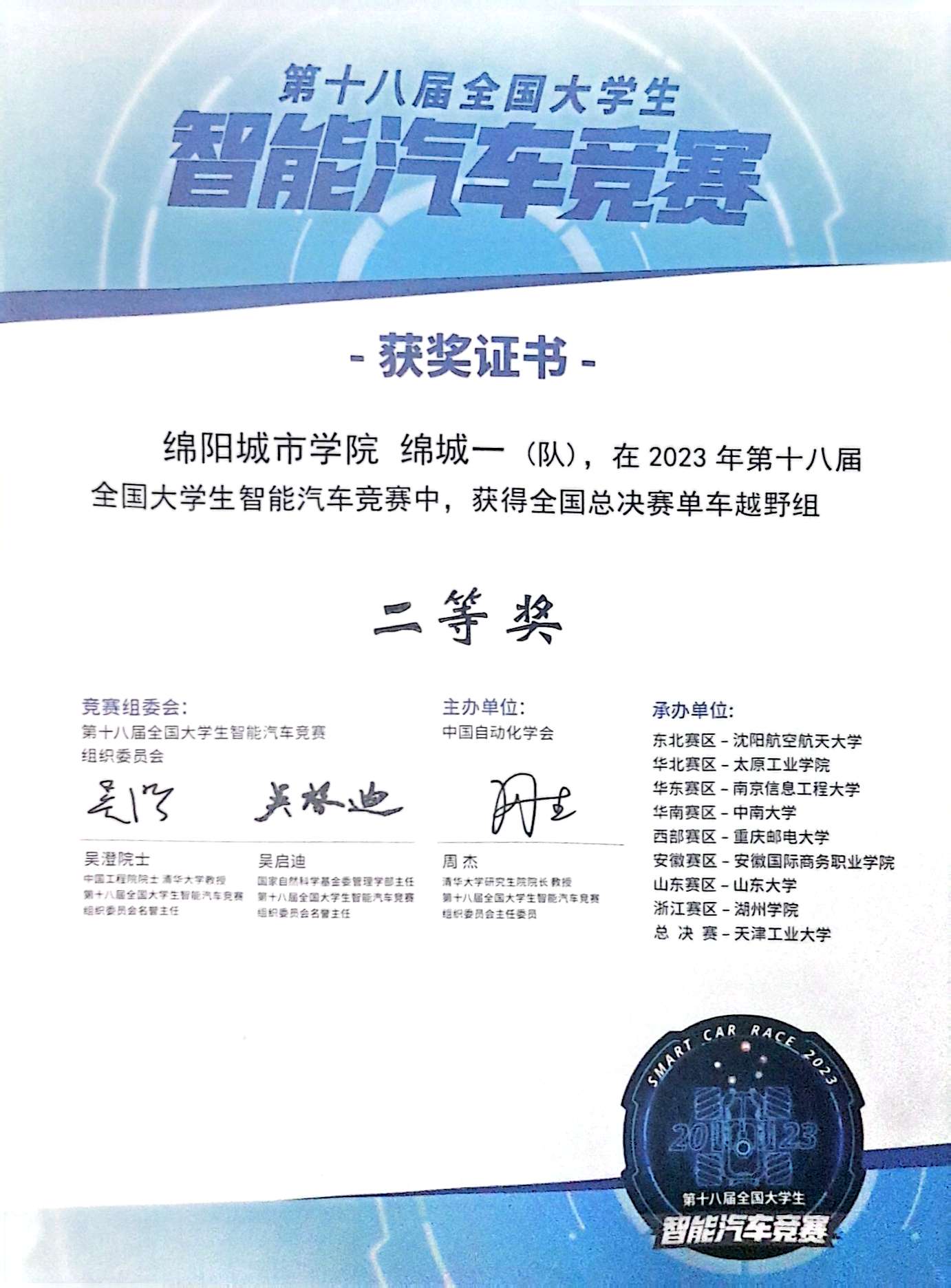近日,第十八届全国老员工智能汽车竞赛(总决赛)在天津工业大学举行。本届大赛自7月份启动以来,采用分赛区选拔赛和全国总决赛的方式组织开展,先后在东北、华北、华东、华南、西部五个分赛区及安徽、山东、浙江三个省赛区完成总决赛队伍的选拔,共吸引来自全国的3138支队伍,508支队伍脱颖而出,进入全国总决赛。总决赛包含清华大学、浙江大学、哈尔滨工业大学、武汉大学、同济大学、东南大学、山东大学、四川大学、国防科技大学、电子科技大学等252所全国高校参赛。经过3天时间的激烈角逐,公司参赛队伍在曹薇、王媛老师的指导下取得佳绩。由邬胜、马俊豪、黄小铭同学组成的“绵城一队”参赛队在单车越野组总决赛中荣获二等奖。